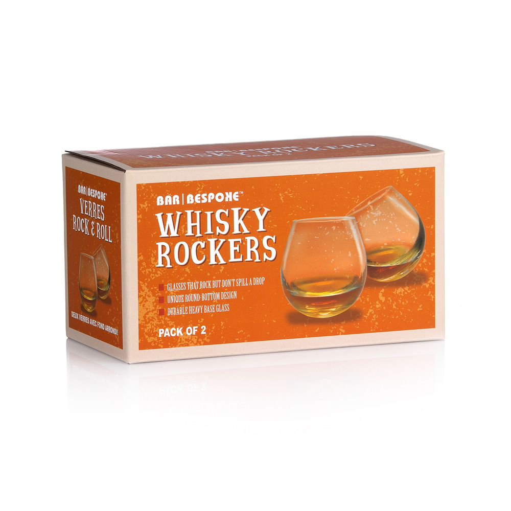 Introducing the Whisky Rocker Glasses, a unique addition to your store's selection of drinkware. Captivate your customers as they watch their favourite drink swirl inside the glass, enhancing the sensory experience by inhaling its delightful aroma. These glasses are not just for sipping, but also for playing a fun party game. Encourage your customers to gently rock the glasses from side to side or spin them, challenging themselves to avoid spilling a single drop. For those seeking a warmer sip, these glasses are perfect for cupping in hand, making them ideal for enjoying brandy, cognac, and even red wine at a temperature that suits their preference. Each glass stands approximately 9cm tall with a diameter of 7.5cm, providing ample 250ml capacity for a satisfying drink, now made in crystal for improved clarity, weight and durability. The newly introduced heavy-weight version ensures durability and a premium feel, while the glasses are thoughtfully packaged in a sturdy Bar Bespoke gift box, ensuring safe delivery to your customers.