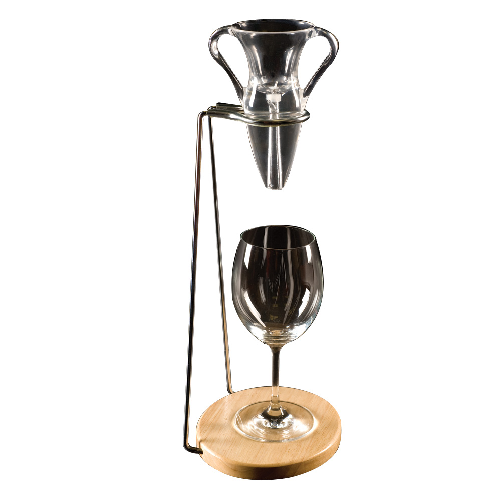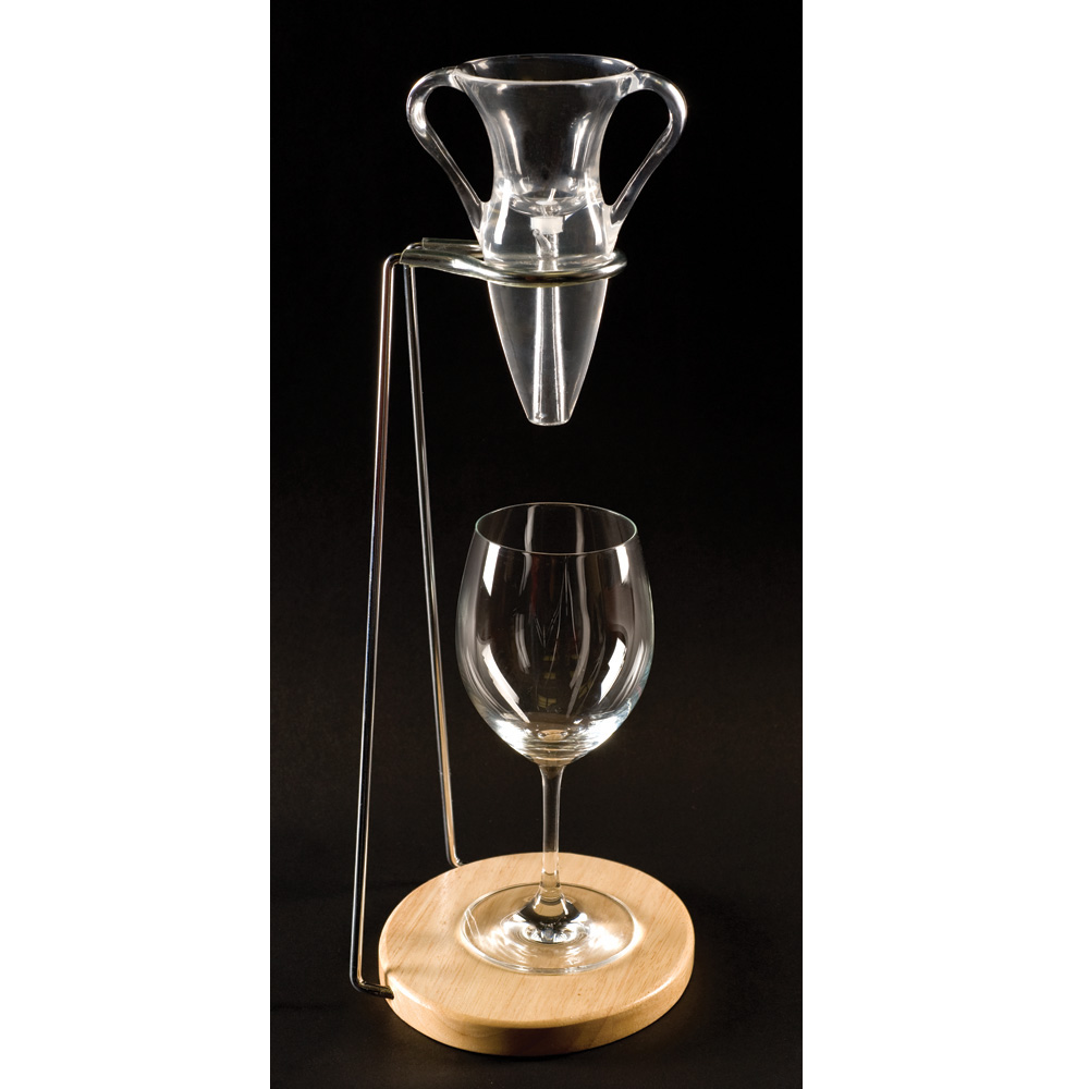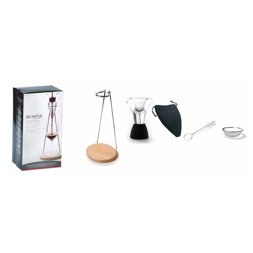 The fine steel mesh screen eliminates sediment and cork while the brush ensures you can remove any red wine stains in the amphora. Supplied with a wood/chrome stand to support the Decantus while pouring, a base for the aerator to prevent drips and even a velvet sack to store away your aerator afterwards.