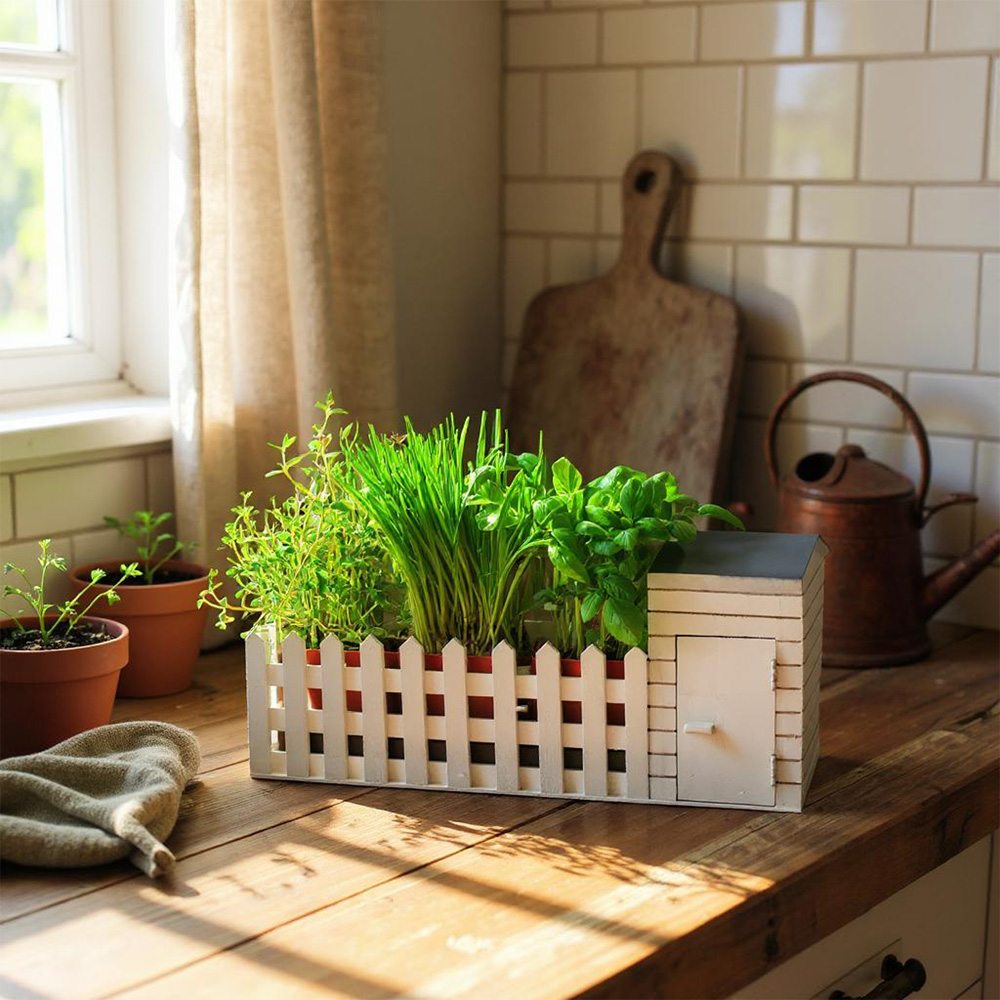 The Indoor Allotment comprises a handmade and painted wooden shed complete with a white picket fence surrounding three miniature plant pots with drainage trays for growing your herbs. The shed is cleverly designed so the roof can be removed and the door swings open to reveal: