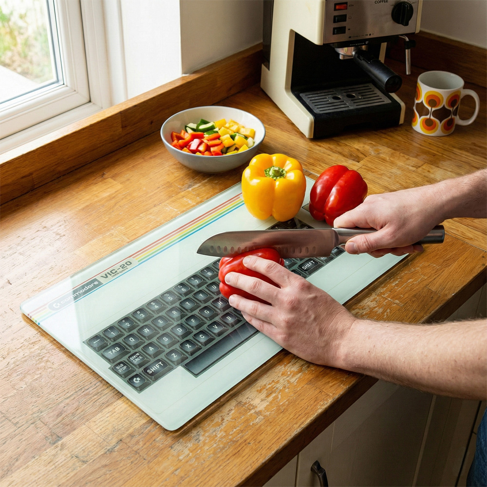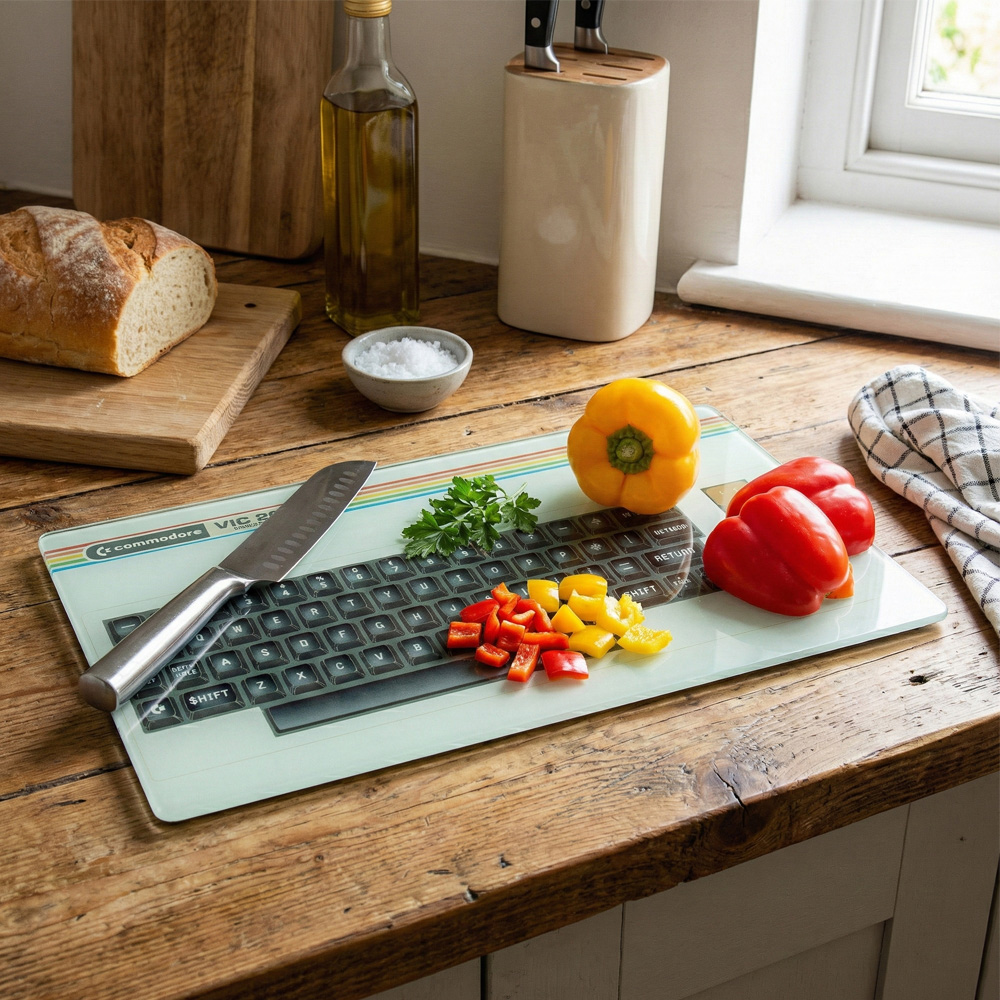 Chop, dice, and prep in retro style with this Commodore Vic-20 inspired glass chopping board.